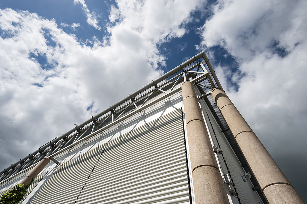 In order to reduce the impact of this substantial building within the landscape, the building is surrounded by manmade drumlins and natural landscaping including a small lake which controls the water discharge into the river.